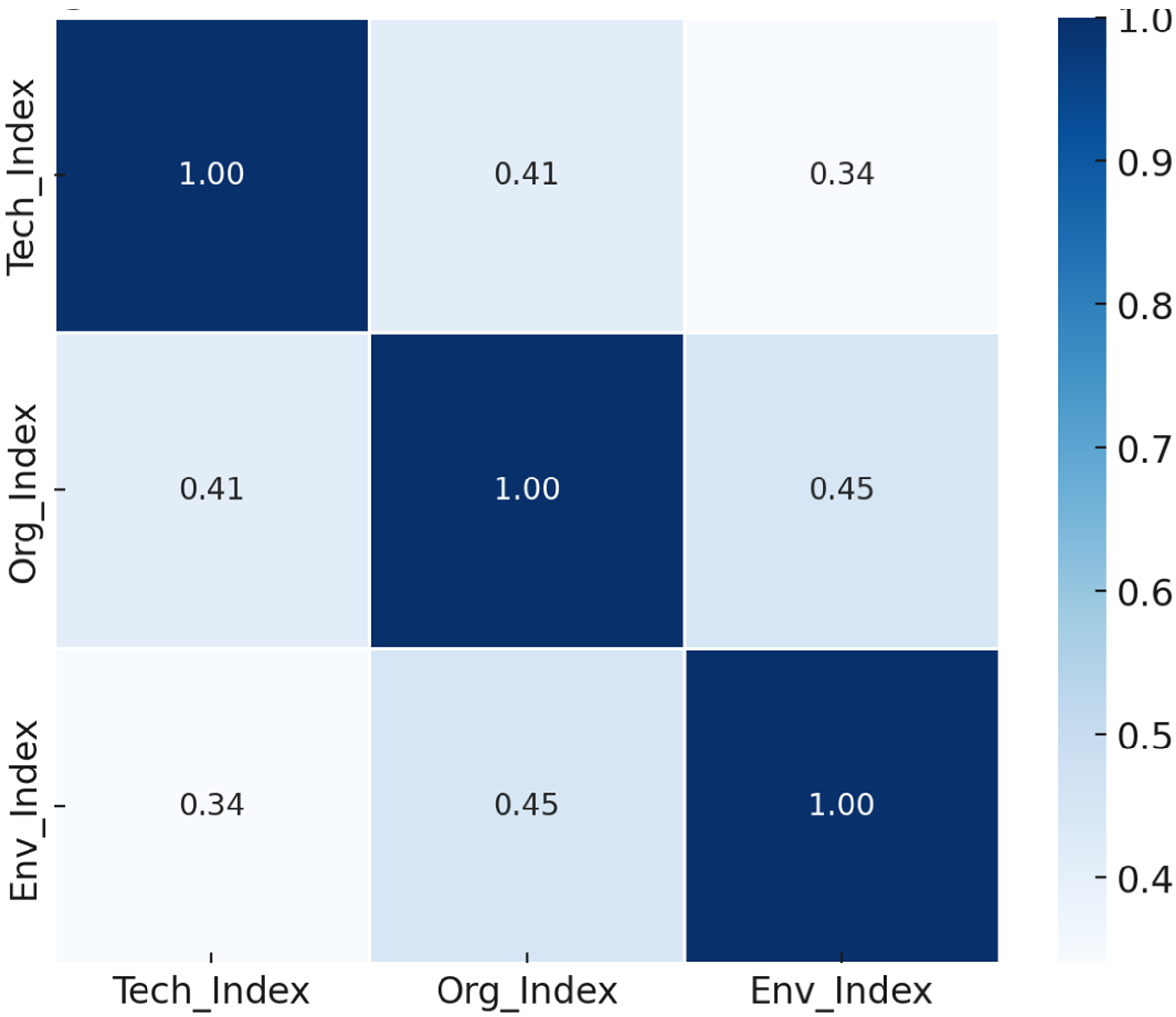 Each item was rated on a five-point Likert scale (1 = strongly disagree, 5 = strongly agree), enabling quantitative analysis of both individual indicators and composite index values for each TOE dimension. The estimated completion time was 5–7 min.