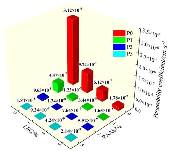 The variation of the permeability coefficient of red clay with modifier content is shown in Figure 2. Specifically, the addition of both PAAS and LBG significantly reduced permeability, exhibiting a typical logarithmic decline: the permeability coefficient decreased significantly at low PAAS dosage levels, then gradually decreased with increasing PAAS dosage levels. For example, when the PAAS dosage increased from 1% to 5%, the permeability coefficient decreased by 85.67%, 96.91%, and 99.41%, respectively, demonstrating a pattern of initially sharp decline followed by a slow stabilization. Similarly, the permeability coefficient of LBG-modified soil also exhibited a logarithmic decline. When the LBG dosage increased from 1% to 5%, the permeability coefficient decreased by 68.78%, 83.59%, and 94.29%, respectively. This trend is consistent with similar studies on red clay modification [29]. This indicates that the modifier plays a significant role in the initial adjustment of the pore structure of red clay, while at high dosages, the pore filling tends to be saturated, and the rate of permeability decline slows down. PAAS can reduce the permeability of red clay more than LBG. When PAAS molecules come into contact with water in the soil, they swell [30], filling the pores in the soil and blocking the seepage channels. The -COO− groups of PAAS adsorb cations (such as Al3+) on the surface of clay particles, compressing the thickness of the double electric layer and reducing the micropores between particles. At the same time, it also forms a dense hydrophilic film covering the surface particles, reducing the pore connectivity. When LBG comes into contact with water in the soil, it dissolves into a high-viscosity colloid, increasing the water flow resistance, partially filling the pores, and slowing down the permeability. Therefore, its effect in reducing permeability is not as good as that of PAAS. PAAS combined with LBG is better than a single material in reducing the permeability of red clay. The permeability coefficient of 5% PAAS + 5% LBG-modified soil is 2.14 × 10−9 cm s−1, which is three orders of magnitude lower than that of plain red clay. PAAS combined with LBG has a synergistic effect in reducing the permeability of red clay. PAAS focuses on sealing micropores, while LBG assists PAAS in filling macropores in the soil and increasing viscous resistance. At the same time, the -COO− of PAAS and the -OH of LBG form hydrogen bonds to crosslink, which enhances the gel skeleton density, reduces the pore size, and further reduces the permeability.