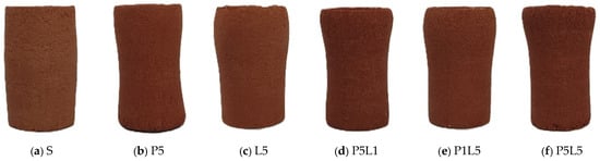 To investigate the effect of modifiers on the failure morphology of red clay, some specimens were taken after triaxial compression testing for observation. The failure morphology of the modified red clay is shown in Figure 3. Both the plain red clay specimen and all modified soil specimens exhibited swelling failure. The swelling region of specimen S was located in the middle of the specimen, while that of specimens L5 and P1L5 was located in the upper midsection. The swelling regions of specimens P5 and P5L1 were located at both ends, while that of specimen P5L5 was located at the upper end.