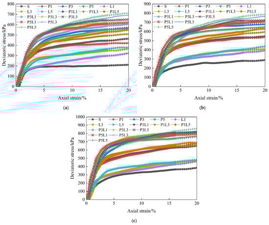 Stress–strain curves of red clay under different modifier addition amounts: (a) 100 kPa; (b) 200 kPa; (c) 300 kPa.