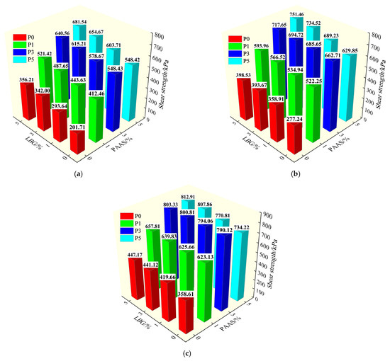 In order to further explore the mechanism of the modifier’s improvement of the shear strength of red clay, the Mohr stress circle was drawn based on the stress–strain curve, and the cohesion and internal friction angle of the modified red clay were calculated, as shown in Figure 6. The cohesion of S is 45.76 kPa, and the internal friction angle is 14.32°. When PAAS is used as a single modifier, as the PAAS dosage increases, the cohesion of the red clay gradually increases, and the internal friction angle first increases and then decreases. Among them, P5 has the largest cohesion, which is 158.40 kPa, and P3 has the largest internal friction angle, which is 16.82°. When the PAAS dosage increases, the -COO− groups on its molecular chain will undergo ionic bonding with the Al3+ and Fe3+ on the surface of the clay particles, forming a dense cementing network [9]. At the same time, when PAAS encounters water in the soil, it will expand and fill the pores [30]. The hydrogel formed will increase the bite force between the particles, thereby increasing the cohesion and internal friction angle of the soil. However, excessive PAAS will form a film to wrap the soil particles, thereby reducing the surface roughness of the particles and reducing the internal friction angle. When LBG is used as a single modifier, as the LBG content increases, the cohesion of the red clay gradually increases, while the internal friction angle gradually decreases. Among them, L5 has the largest cohesion and the smallest internal friction angle, which are 128.42 kPa and 10.77°, respectively. After adding LBG to the red clay, the hydroxyl groups (-OH) of LBG will wrap the clay particles through hydrogen bonding to form a cementing network. As the LBG content increases, the cementing network of the soil gradually becomes denser, the agglomeration effect is enhanced, and the bonding force between the particles increases. However, due to the hydrophilicity of LBG [32], the bound water model of the particles becomes thicker, the roughness between the particles is reduced, and the internal friction angle decreases. Comparing PAAS and LBG, the hydrogen bond strength of LBG is smaller than the ionic bond strength of PAAS. At the same time, PAAS can simultaneously improve the cohesion and internal friction angle of red clay at a certain content, while LBG can only improve the cohesion of red clay. Therefore, the effect of PAAS in improving the shear strength of red clay is better than that of LBG.