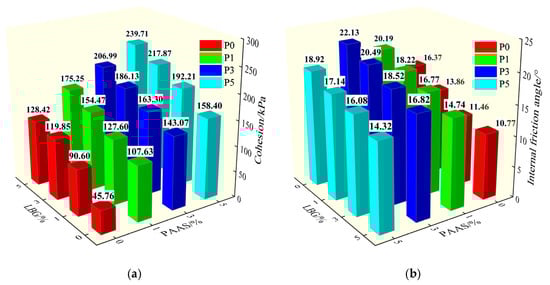 Shear strength index changes with modifier dosage: (a) cohesion; (b) internal friction angle.