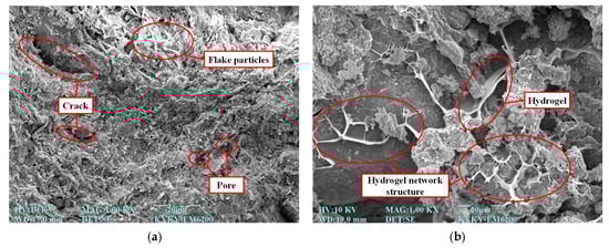 When PAAS and LBG are combined and incorporated into red clay, PAAS forms a stable and continuous hydrogel network structure due to water absorption and expansion, becoming the primary skeletal support system for the soil. Simultaneously, LBG, through its viscosity, wraps and binds fine soil particles, forming LBG-soil aggregates that effectively fill the inter-particle pores and voids. The PAAS hydrogel network provides high structural stability and overall cohesion, while the LBG aggregates further increase the packing density and inter-particle contact area. This dual mechanism significantly reduces the porosity of the red clay, tightens its internal structure, and strengthens the adhesion and inter-particle interlocking, significantly improving the soil’s shear strength. Furthermore, the dense structure and reduced seepage channels effectively enhance the soil’s impermeability, giving the modified red clay superior engineering properties in terms of load-bearing and durability.