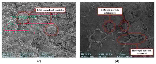 Figure 7 shows SEM images of soil modified with different materials. The microstructure of plain red clay is primarily composed of stacked, flaky particles. The particles are scattered and overlap, and intergranular pores are prominent, as shown in Figure 7a. After mixing with red clay, PAAS adheres to the soil particles. When exposed to water, the PAAS absorbs water and swells to form a hydrogel. The hydrogel fills the pores and connects the soil particles, forming a hydrogel network structure that connects the dispersed soil particles into a single entity, enhancing cohesion and making the soil structure denser [9], as shown in Figure 7b. When LBG is added to red clay, it encapsulates the soil particles, forming LBG-soil particle aggregates, improving the soil’s integrity. Within the aggregates, the negative charges of the clay minerals adsorb the cations of the LBG, increasing their cohesion. Simultaneously, locust bean gum effectively fills the pores between soil particles, increasing soil density, as shown in Figure 7c. When PAAS is combined with LBG to modify red clay, the PAAS hydrogel network serves as the main structure, connecting the soil particles, while the LBG and the LBG soil particle aggregates formed by LBG encapsulating the soil particles are responsible for filling the intergranular pores. The synergistic effect of PAAS and LBG densifies the soil structure, improves shear strength, and enhances impermeability.