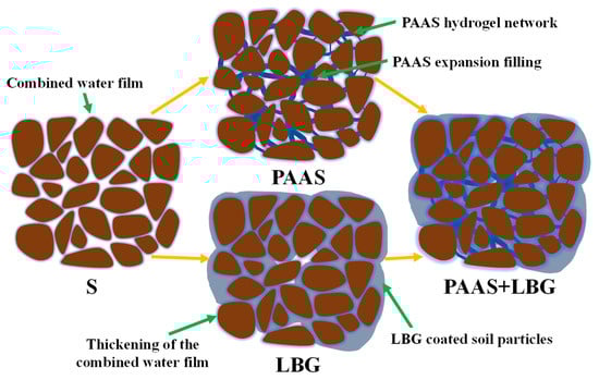 Figure 8 illustrates the mechanism of soil modification using different materials. Plain red clay particles are relatively dispersed. When PAAS is added alone to red clay, it absorbs water and swells to form a hydrogel. The hydrogel fills the pores between soil particles, reducing the number of pores within the soil, diminishing the permeable structure, and lowering the permeability of the soil. Simultaneously, the hydrogel forms a hydrogel network that binds the dispersed soil particles together, enhancing the intergranular bite and improving cohesion. This creates a denser embedding between soil particles, resulting in a stable soil structure. Furthermore, because PAAS forms ionic bonds with the surface of clay particles, it also forms a dense hydrophilic film covering the surface particles, thereby hindering the passage of water molecules, reducing interparticle friction, and the internal friction angle. This effect is consistent with recent findings from microstructural studies [33]. Furthermore, the highly cohesive hydrogel network structure formed by PAAS significantly enhances the shear strength of the soil. Furthermore, when LBG is added alone to red clay, it coats the soil particles and promotes the formation of LBG-soil particle aggregates, thereby improving the integrity of the soil.