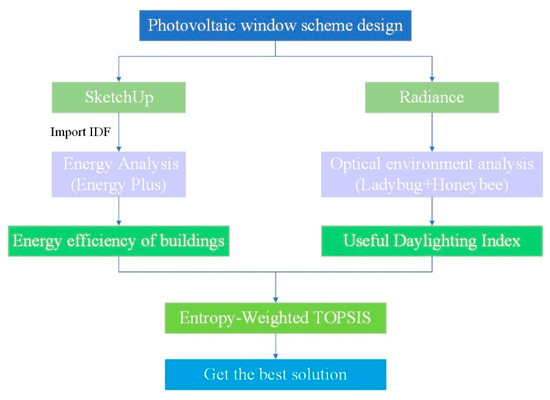 The research mainly consists of three parts: scheme design, building energy consumption and light environment simulation, and comprehensive evaluation. The detailed process is shown in Figure 2. Based on the shortcomings of traditional CdTe PV windows, this study proposes a three-domain division CdTe PV window that meets the height requirements of most people, and designs 84 schemes to analyze the influence of different design parameters (coverage rate and arrangement mode) of CdTe PV windows on building comprehensive energy consumption and indoor light comfort. This content has been introduced in Section 3.1 of the manuscript. The building energy consumption, indoor light environment simulation software, and evaluation indicators, as well as various simulation schemes of the three-domain division CdTe PV window, are clarified in Section 3.2 and Section 3.3. Section 3.4 focuses on describing the principle and steps of the comprehensive entropy weight–TOPSIS evaluation method, aiming to comprehensively evaluate the energy consumption and daylight performance of different schemes of PV windows and thereby obtain the optimal scheme.