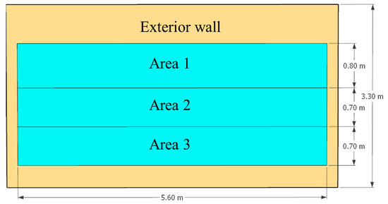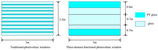 In view of this, based on the traditional CdTe PV window, this study divided the window into three areas—Area 1, Area 2, and Area 3, enabling each area to perform different functions and meet various needs. Figure 4 shows the differences between the traditional photovoltaic window and the three-domain division photovoltaic window. Among them, the main functions of Area 1 and Area 3 are to carry out PV power generation and undertake a small portion of lighting tasks; Area 2 focuses on meeting the indoor visual landscape and lighting requirements and also undertakes a small portion of the power generation responsibility. To meet the needs of most people of various heights, the upper and lower parts of Area 2 are 1.1 m–1.8 m away from the floor. The design dimensions of the three-domain division CdTe PV window are shown in Figure 5.