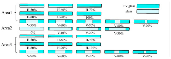 Sun [12] proposed the combined application of ordinary transparent glass and PV glass. Not only does this combination enhance the aesthetic value through the differences in color and texture between them, but also the use of ordinary transparent glass provides better visual transparency. In this study, this approach was adopted in each region. The parameters of ordinary glass and PV glass are shown in Table 2 [28,29,30]. Considering the main functions of each area and referring to relevant literature [20], a 50–100% PV coverage rate was used in Area 1 and Area 3, while Area 2 used a 0–30% PV coverage rate, which refers to the ratio of the area of PV modules to the total area of the region. A coverage of 100% means that CdTe PV is installed in this area, while 0% coverage means that this area is all ordinary glass and no PV modules are used. This study also considers the impact of the layout method of solar cells (i.e., horizontal and vertical) on the power generation of PV systems and the indoor lighting environment. To ensure the continuity of the visual effect, the horizontal PV panels in Area 1 are arranged from top to bottom, while the horizontal PV panels in Area 3 are arranged in the opposite direction, from bottom to top. The vertical PV panels in both areas are arranged following the principle of from both sides to the middle. In Area 2, only the vertical arrangement of the PV panels is considered. As shown in Figure 6, this study has proposed a total of 84 schemes. To simplify the expression, H and V are used to represent the horizontal and vertical layouts of PV panels, respectively. For example, H3-50%-V2-20%-V1-70% represents the horizontal layout of PV panels in Area 3, with a coverage rate of 50%; the vertical layout of PV panels in Area 2, with a coverage rate of 20%; and the vertical layout of PV panels in Area 1, with a coverage rate of 70%.