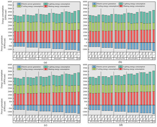 Building energy consumption value of different schemes: (a) Area2 0%; (b) Area2 10%; (c) Area2 20%; (d) Area2 30%.