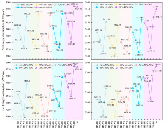 Figure 7 illustrates the annual energy consumption of the building, including summer heat load, winter cold load, and lighting load, as well as the annual photovoltaic power generation under varying PV coverage rates and arrangement modes. Figure 7a–d represent scenarios in which the PV coverage rate on the lighting area (Area 2) is 0%, 10%, 20%, and 30%, respectively. An increase in PV coverage results in a progressive reduction in solar heat gain indoors. Consequently, under the same layout configuration, the building’s heat load increases gradually with higher coverage rates, while the cold load exhibits a decreasing trend. As shown in Figure 7, lighting energy consumption increases progressively with the rise in PV coverage. Initially, the growth rate is relatively moderate, but it becomes more pronounced in later stages. This phenomenon is primarily attributed to the lower transmittance of cadmium telluride PV glass compared to conventional glass. As the PV coverage rate increases, the amount of natural light entering the indoor space decreases accordingly. When the PV coverage rate remains below a certain threshold, natural light can generally satisfy the minimum indoor illuminance requirement of 300 lx. In such cases, artificial lighting is not required, resulting in relatively stable lighting energy consumption with minimal fluctuations. However, once the coverage rate surpasses this threshold, indoor natural light intensity falls below 300 lx, necessitating the use of artificial lighting to compensate for the deficiency. As the coverage rate continues to rise, the intensity of natural light further diminishes, leading to a significant increase in lighting energy consumption in the subsequent stages. For instance, in Figure 7a, the lighting energy consumption values for the configurations H3-50-H1-50, H3-60-H1-60, H3-70-H1-70, H3-80-H1-80, and H3-90-H1-90 are 889.07 kWh, 994.84 kWh, 1128.66 kWh, 1313.45 kWh, and 1590.64 kWh, respectively, with corresponding increments of 105.77 kWh, 133.82 kWh, 184.79 kWh, and 277.19 kWh. When the PV coverage rate is held constant, the arrangement mode significantly influences the building’s overall energy consumption. Figure 8 illustrates the net energy consumption across various configurations. It can be observed that the overall energy consumption associated with the H3-H1 and V3-H1 layout methods is considerably higher than that of V3-V1 and H3-V1. Under identical coverage rates, the four PV arrangement modes (H3-H1, V3-V1, H3-V1, V3-H1) result in a net energy consumption trend that initially decreases and subsequently increases. This variation can be attributed to the differing angles at which natural light enters the indoor space throughout the day. The horizontal or vertical arrangement of PV panels exerts varying shading effects on light at different angles. Although PV power generation increases with higher coverage rates, the arrangement mode has minimal impact on the overall power generation.