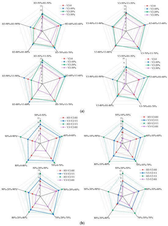 Figure 9a,b illustrate the influence of varying regional PV coverage rates and PV arrangement modes, respectively, on the building energy efficiency rate. As shown in Figure 9a, when the PV coverage rates of Areas 1 and 3 are held constant, an increase in the coverage rate of Area 2 generally results in an initial rise followed by a decline in the building energy-saving rate. Typically, after reaching a coverage rate of 10–20%, the energy efficiency rate begins to decrease. When the PV coverage rate of Area 2 is fixed, a similar trend is observed with increasing coverage rates of Areas 1 and 3. However, in general, changes in the PV coverage rates of Areas 1 and 3 have a more pronounced effect on enhancing the building energy-saving rate. For instance, taking the configuration H3-50%-H1-50% as a reference, when the PV coverage rate of Area 2 increases from 0% to 30%, the building energy-saving rate decreases by 0.5%. In contrast, when the coverage rates of Areas 1 and 3 increase from 50% to 80%, the building energy-saving rate increases by 0.1%. Therefore, appropriately increasing the PV coverage in Areas 1 and 3 proves to be more effective in improving building energy efficiency than increasing coverage in the shading region.