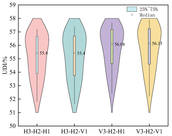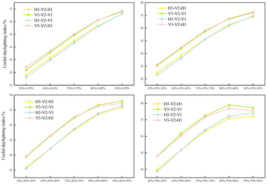 Figure 11 shows the impact of four different PV arrangement modes, including H3-H1, H3-V1, V3-V1, and V3-H1, on the proportion of effective natural lighting time in the building interior. From the figure, it can be seen that the effects of the four arrangement modes can be divided into two categories: V3-V1 and V3-H1 belong to one category, while H3-H1 and H3-V1 belong to another. All four subfigures show that the indoor light comfort effect of the former is better than that of the latter. For example, with a coverage rate of 50%-0-50%, the UDI300lx–2000lx values under the four arrangement modes are 51.82%, 51.64%, 52.2%, and 52.42%, respectively.