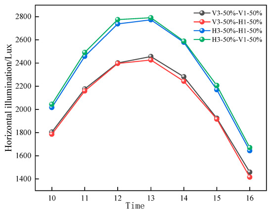To further reveal the impact of CdTe PV arrangement on the indoor lighting environment, this study observed the observation point at a distance of 1.25 m from the window and simulated the illumination changes on the indoor working plane from 10 a.m. to 4 p.m. on April 20th. From Figure 12, it can be clearly observed that when the layout of Area 3 is the same, the horizontal and vertical layouts of Area 1 have little effect on the illuminance. The vertical layout of the window has a slightly higher illuminance than the horizontal layout. However, when the layout of Area 1 is the same, Area 3 has a more significant impact on the indoor illuminance. At the same time, the illuminance of H3-50%-V1-50% is less than that of V3-50%-V1-50% at 15 o’clock, with the illuminance being 2206.06 lx and 1923.68 lx, respectively. This indicates that the vertical layout of the PV panels in Area 3 can resist more direct sunlight, while the layout of Area 1 has little effect. During the day, the light mainly enters at a low angle and covers Areas 2 and 3; only at noon does the light mainly enter at a high angle, and most of it is directed at Areas 1 and 2. The vertical layout of the PV panels in Area 3 presents a continuous strip-like shading for low-angle oblique sunlight; while the horizontal strip shading blocks the light more dispersedly.