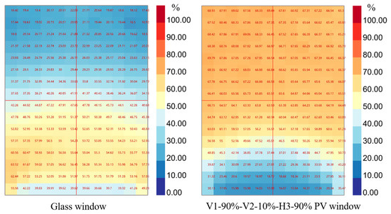 This study calculated the weights of the energy-saving rate index and the UDI300lx–2000lx index using the entropy weight–TOPSIS method, which were 0.38 and 0.62, respectively, and the comprehensive scores of 84 cadmium telluride PV window design schemes were obtained. In Table 3, the top five comprehensive scoring schemes and the optimal schemes considering only energy consumption or light comfort are listed. Among them, the comprehensive optimal solution is V1-90%-V2-10%-H3-90%, the solution with the highest energy-saving rate is V1-60%-H2-20%-H3-60%, and the optimal solution for light comfort is V1-80%-V2-30%-V3-80%. Figure 14 shows the UDI300lx–2000lx distribution map of the V1-90%-V2-10%-H3-90% CdTe PV window, which is the comprehensive optimal solution, and the ordinary glass window. From the figure, it can clearly be seen that the UDI300lx–2000lx of the V1-90%-V2-10%-H3-90% CdTe PV window is greater than that of the ordinary glass window. The time proportion of UDI300lx–2000lx of the V1-90%-V2-10%-H3-90% CdTe PV window is 56.95%, which is 18.33% higher than that of the ordinary glass window (38.62%). This is mainly because the ordinary glass window has a high transmittance and a poor shading effect, which easily causes light spots, and the illuminance at these light spot areas is often greater than 2000 lx. From the figure, it can also be observed that with the increase in the building depth, the proportion of UDI300lx–2000lx first increases and then decreases, and the UDI300lx–2000lx near the window is smaller, while the UDI300lx–2000lx near the center of the room is the largest.