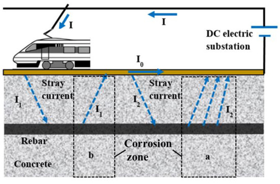 Schematic illustration of stray current leakage from a DC railway system and its pickup by rebar embedded in concrete [48].