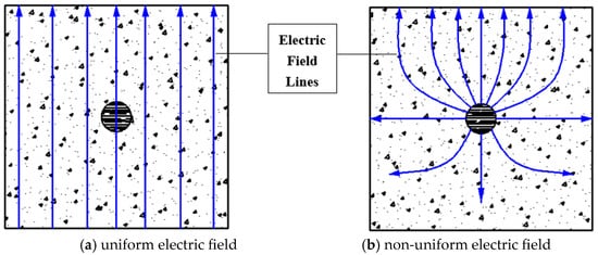 The electrified rail transportation systems, such as high-speed railways and metros, typically operate on direct current (DC) power, with the train-running rail serving as the DC return conductor. As illustrated in Figure 1, the power supply system of the train delivers high-voltage direct current. Current flows from the positive terminal of the power supply, through the train-running rail, and returns via the running track to the negative terminal. Consider the traction current of the electric locomotive as I. If the train-running rail is completely insulated from the ground, all the current should flow through the train-running rail. In fact, multiple electrical leakage points exist between the rails and the surrounding soil, inevitably causing current leakage and forming stray current I1. This stray current can penetrate underground RC structures and be picked up by the steel reinforcement [42,43,44]. Although alternating current (AC) systems can also generate stray current [45], this study primarily focuses on DC-induced stray current due to its significantly higher associated risks compared to AC-induced stray current [46]. The number and distribution of electrical leakage points influence the electric field generated by stray current within the RC structure. This internal electric field distribution affects both the chloride-induced corrosion process and the distribution of chloride ions. To analyze the resulting electric fields, when stray current flows through the rebar, the rebar can be regarded as composed of numerous point charges, with the surrounding soil or adjacent metals acting as planar electrodes [47]. For analytical purposes, this study considers two primary simplified representations of stray current effects, as illustrated in Figure 2: a uniform electric field is assumed for scenarios with numerous, densely distributed leakage points (Figure 2a), while a non-uniform electric field is represented for scenarios with sparse leakage points (Figure 2b).