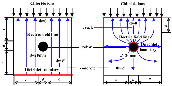 (1) It is assumed that chloride ions ingress concrete from a single direction. To consider the most dangerous situation for RC structures, there is only one uniformly wide crack in the cracked concrete, which is precisely located directly above the rebar, as shown in Figure 3.