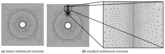 (4) Additionally, triangular elements are used for mesh discretization in this study. In order to obtain the most accurate calculation results, the size of the mesh must be ensured to be small enough. So, the mesh is refined in areas with large changes in chloride ion concentration gradients, such as near the crack and around the rebar. This approach adheres to the convergence criteria established by Qiu et al. [54,55] and enhances numerical accuracy, as shown in Figure 4.