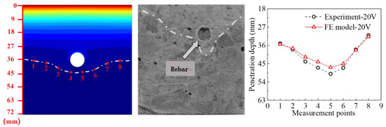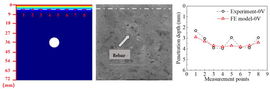 To validate the accuracy of the numerical model, this study simulates the chloride distribution in intact concrete under both no-electric-field and non-uniform-electric-field conditions, and compares the simulation results with the experimental data from Geng et al. [57], as shown in Figure 5 and Figure 6. The specific parameters for the experiment and FE model are summarized in Table 2. It can be seen from Figure 5 and Figure 6 that under the single effect of diffusion, the erosion distribution of chloride is relatively uniform, with a relatively small penetration depth; under the non-uniform-electric-field conditions, chloride exhibits an approximately quadratic distribution, with significantly higher concentrations near the rebar and an increased penetration depth. Meanwhile, it can be seen from the curve comparison chart that the numerical magnitude and trend of the numerical simulation are very similar to those of the experimental data of Geng et al. [57], but certain differences persisted. Numerical simulation results remained stable, while experimental data exhibited significant fluctuations resulting from experimental uncertainties. This also indicates that the model demonstrates excellent engineering prediction capabilities under simplified assumptions, but the application of complex working conditions requires further multiphysics field coupling. These findings indicate that stray current accelerates chloride migration in concrete, causing chloride to accumulate toward the rebar surface, thereby increasing the chloride concentration at the rebar interface and shortening the depassivation time. In conclusion, the proposed FE model can effectively predict the chloride ingress process in concrete under stray current.
