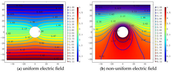 (3) The stray current effect is realized in COMSOL by applying Dirichlet boundary conditions: fixed potential values are set on the upper and lower surfaces of the concrete to simulate a uniform electric field; fixed potential values are applied on both the surface of the rebar and the upper surface of the concrete to simulate a non-uniform electric field [22], as shown in Figure 3.