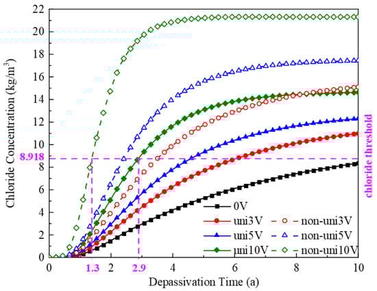 This study numerically simulated the characteristics of uniform and non-uniform electric fields generated by stray current, with their corresponding potential distributions shown in Figure 7. Figure 8 further presents the chloride concentration distributions at a specific time point (t = 100 days) under 0 V (no stray current), 5 V, and 10 V electric field intensities (uniform and non-uniform fields). The results indicate that compared to the no-stray-current condition (0 V), both uniform and non-uniform electric fields significantly alter chloride concentration distributions, with higher electric field intensities leading to faster chloride ingress rates and greater ingress depths. Under the same current intensity, the chloride ingress depth in non-uniform electric fields is substantially larger than in uniform fields, indicating an earlier onset of rebar corrosion. By analyzing the temporal evolution of chloride concentration on the rebar surface under different stray current conditions (Figure 9), it is observed that when subjected to a 10 V electric field, the depassivation times (defined as the time to reach the chloride threshold concentration) for uniform and non-uniform fields are approximately 2.9 years and 1.3 years, respectively, with the non-uniform field exhibiting a depassivation rate approximately 2 times faster than that of the uniform field. Compared to the no-stray-current condition (0 V, approximately 12 years), the depassivation time under 10 V uniform and non-uniform electric fields was reduced by approximately 4 to 9 times. In summary, the application of stray electric fields significantly accelerates the chloride-induced corrosion process, with greater field intensities producing more pronounced effects. Under identical electric field intensities, non-uniform fields exhibit a stronger promoting effect on chloride ingress than uniform fields, resulting in earlier rebar depassivation and higher risks of structural durability degradation.