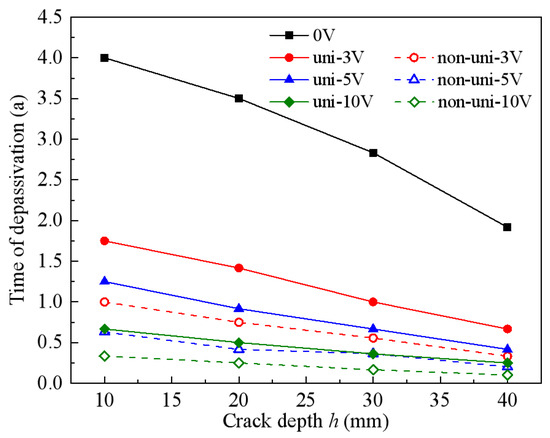 Effects of stray current and crack depth on depassivation time (w = 60 μm, t = 1 year).
