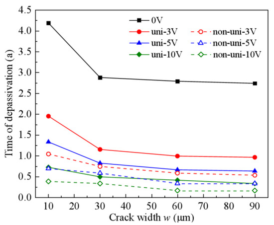 Effects of stray current and crack widths on depassivation time (h = 30 mm, t = 1 year).
