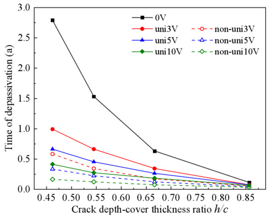 For cracked RC structures, the protective performance of the concrete cover is significantly influenced by crack depth. Thus, the influence of the crack depth/cover thickness ratio (h/c) on the rebar depassivation time in cracked concrete is examined in this section. The crack depth is fixed at 30 mm, while the cover thickness is varied to 65 mm, 55 mm, 45 mm, and 35 mm, resulting in h/c ratios of 0.462, 0.545, 0.667, and 0.857, respectively. Figure 14 presents the variation curve of rebar depassivation time under the combined effects of stray current and h/c ratio. The results indicate that (1) the depassivation time decreases significantly and nonlinearly with increasing h/c ratio; (2) under the same h/c ratio, the depassivation time further decreases with increasing stray current intensity, particularly in non-uniform electric fields. Specifically, without considering stray currents, when the h/c ratio increases from 0.462 to 0.857, the depassivation time sharply decreases from 2.8 years to 0.1 years, a reduction of 28 times; when the h/c ratio is fixed at 0.462, the depassivation time under 10 V uniform and non-uniform electric fields is 0.4 years and 0.2 years, respectively, which is 7 times and 14 times shorter than that without stray currents. In conclusion, the combined effect of stray current and h/c ratio significantly accelerates chloride ingress in concrete. When the h/c ratio approaches 0.9 (i.e., crack depth nears cover thickness), the depassivation time of rebar tends to zero, indicating that the concrete cover loses its protective function for structural durability.