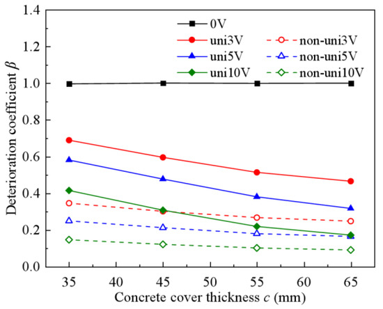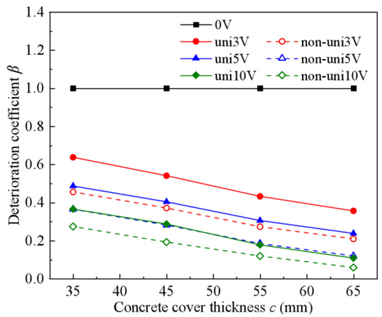 Similarly, under the condition of a 30 mm crack depth and 60 μm crack width, the deterioration coefficient β of cracked RC structures is calculated, and the influence of stray current and concrete cover thickness on β in cracked RC structure is further given in Figure 16. It can be seen that when stray current effects are neglected, β remains constant at 1; as the stray current intensity or concrete cover thickness increases, β decreases significantly following an approximate quadratic function (dominated by stray current intensity) and gradually decreases following an approximate linear function (dominated by cover thickness), respectively, with β values under non-uniform electric fields being smaller than those under uniform electric fields. Therefore, for cracked RC structures, a quadratic power function and a linear function can still be adopted to characterize the relationship between β and stray current intensity and concrete cover thickness, respectively, thereby establishing a regression prediction model for β.