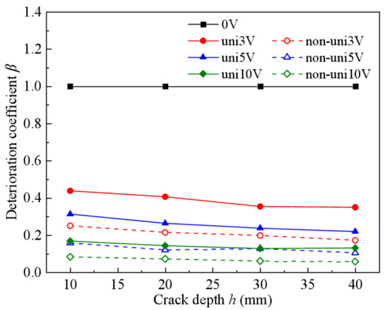 Effects of stray current and concrete crack depth on β (c = 65 mm, w = 60 μm).