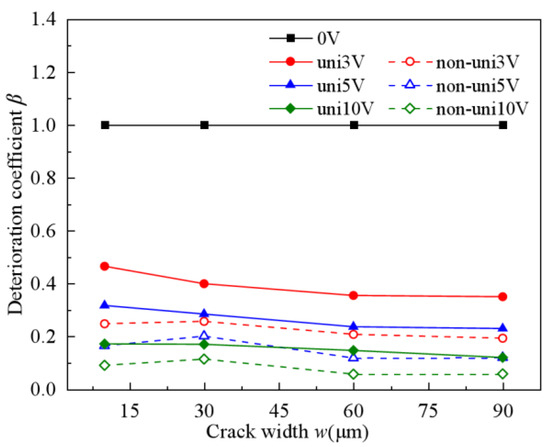 According to the depassivation time of rebar calculated in Section 3.2 and incorporating crack depth and width parameters, the deterioration coefficient β of cracked RC structures is determined. Using a concrete cover thickness of 65 mm, a crack depth of 30 mm, and a crack width of 60 μm as benchmark parameters, Figure 17 and Figure 18 illustrate the influence of stray currents, crack depth, and crack width on the β value, respectively. Consistent with previous findings, β remains constant at 1 when there is no stray current; as stray current intensity increases, β decreases significantly following an approximate quadratic function, with lower β values observed under non-uniform electric fields compared to uniform fields. Notably, variations in crack depth and width exhibit negligible effects on β, with minimal changes observed. Consequently, the regression prediction model for β excludes crack depth and width as influencing factors in this study.