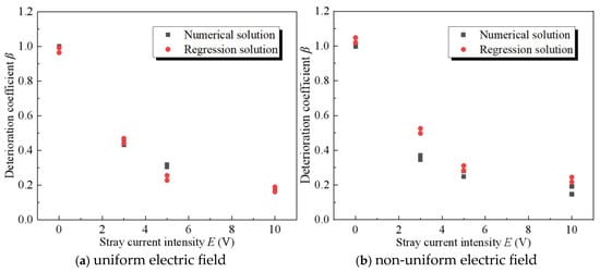 where E is the stray current intensity (V), c is the concrete cover thickness (mm), a1~a4 and b1~b4 are coefficients of regression, and μ and η are dimensionless parameters, defined as and . According to the numerical results of parameter analysis in Section 4.1, Section 4.2 and Section 4.3, the regression coefficients in Equation (11) are determined by 1st Opt (First Optimization) software [59], and finally, the regression formula for β shown in Equation (12) is obtained, with R-squares of 0.9525 and 0.9569, respectively.