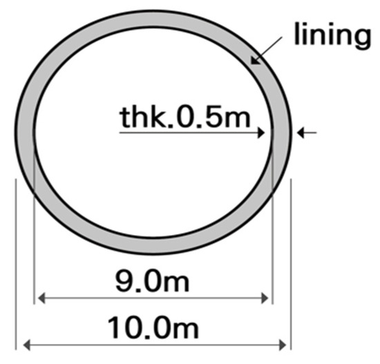 where σmax is the maximum compressive stress obtained from the numerical analysis, I is the moment of inertia of the tunnel lining cross-section, and y is the distance from the neutral axis to the extreme compression point. The section properties were defined based on the structural specifications for the double-track tunnel lining as specified in the Korea National Railway Construction Standard (KR C-12040).
