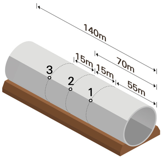 To ensure computational stability and accuracy, the mesh size within the model was adjusted based on proximity to the tunnel. Specifically, the tunnel lining had an element size of 0.5 m, the adjacent ground had element sizes as small as 0.64 m, and the far-field ground region used element sizes ranging from 3.5 m to 4.15 m. As shown in Figure 2, three monitoring points were defined to extract dynamic responses, including displacement and structural forces: Point-2 (crown at tunnel center), Point-1 (15 m upward from the center), and Point-3 (15 m downward from the center).