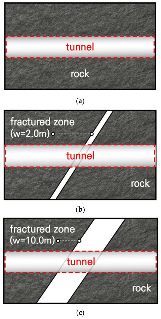Schematic drawing of numerical analysis cases: (a) Case 1 (hard rock), (b) Case 2 (w/narrow fracture zone), and (c) Case 3 (w/wide fracture zone).