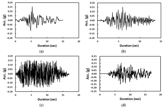 Input earthquake time history: (a) Hachinohe (long period), (b) Ofunato (short period), (c) artificial, (d) Kobe (medium period).