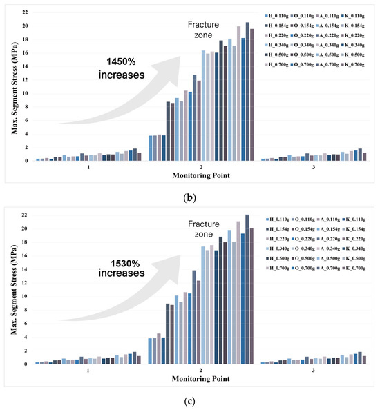 In contrast, Cases 2 and 3, which involved fractured zones, exhibited pronounced stress concentration at Point-2. As shown in Figure 5b,c, the lining stress at Point-2 significantly exceeded those at the other points, especially under higher PGA conditions. For instance, in Case 2, the maximum compressive stress at Point-2 under 0.7 g ground motion reached approximately 2.05 times the allowable moment value, while in Case 3, it exceeded 2.2 times the allowable limit. This localized stress amplification confirms that the presence of fractured zones dramatically increases the seismic demand on tunnel structures, particularly when the tunnel intersects the fractured zone directly. As such, the structural integrity of tunnel segments in these zones is at greater risk under seismic excitation. The selection of monitoring points was based on engineering judgment anticipating localized stress concentrations near the fractured zone. Point-2 was defined at the tunnel crown where the fractured zone intersected the lining, and Points 1 and 3 were placed 15 m vertically above and below to capture the distribution of seismic response in the vertical direction. These points were intended to reflect the most critical region influenced by the fractured ground without requiring full-length stress mapping.