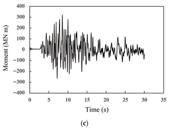 Bending moment time history at point 2: (a) Case 1—hard rock, (b) Case 2—narrow fracture zone, (c) Case 3—wide fracture zone.