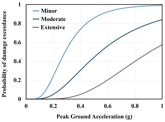Based on the damage state classifications described above and the corresponding ground motion groupings presented in Table 5 and Table 6, the final seismic fragility functions were derived. These functions characterize the probability of exceeding each damage state as a function of peak ground acceleration (PGA), and can be mathematically expressed using a lognormal cumulative distribution function, as shown in Equation (4).