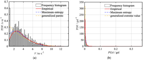 The first six moments of the PGA of offshore ground motion and simultaneous wind speed data are shown in Table 3. Furthermore, by substituting it as a constraint condition into Equations (5) and (7), the nonlinear equation system was solved, and the parameters were determined. The final results are shown in Table 4. Subsequently, in order to demonstrate the correctness of the maximum entropy model, the empirical kernel density function of the data was used as the target value to compare the results of the maximum entropy method and maximum likelihood estimation in Figure 5. Among them, the alternative probability models for maximum likelihood estimation include 17 probability models such as generalized extreme value distribution, Gumbel distribution, Weibull distribution, gamma distribution, etc., which shown in Table 5 and Table 6 [40]. Intuitively speaking, the result of maximum entropy estimation is closer to the empirical mode function. Furthermore, taking peak acceleration as an example, the determination coefficients of the two methods were calculated to be 0.90 and 0.57, respectively. Therefore, it can be proven that the fitting effect of maximum entropy theory is significantly better than that of maximum likelihood estimation.