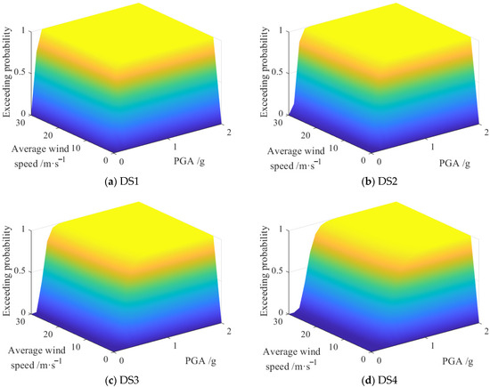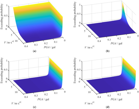 To further analyze the joint hazard of offshore ground motion and strong winds, let X represent the PGA of offshore ground motion and Y represent the average wind speed of strong winds. In this study, we utilize maximum likelihood estimation and the Bayesian Information Criterion BIC to select the optimal Copula function from five types of Copulas, including the Gaussian Copula and T Copula from the elliptical family, as well as Clayton, Plackett, and symmetric Clayton-type Copulas [42]. Ultimately, the selected optimal Copula function is the Gaussian Copula, with a corresponding Copula parameter of −0.028. Based on Equations (13)–(16), the calculated joint hazard function is illustrated in Figure 6. Subsequently, Table 7 presents the recurrence periods of four joint hazard models under different peak ground acceleration and wind speed conditions, leading to the following conclusions: