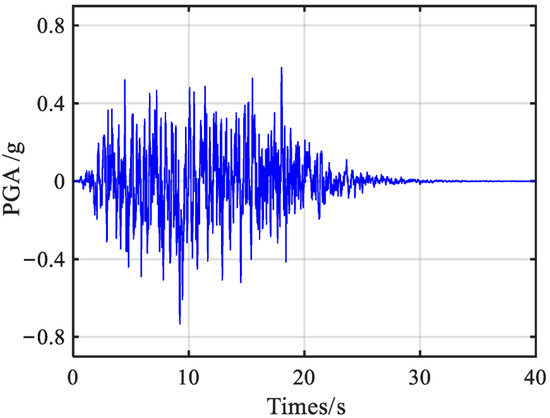 where and stand for the dominant frequency and critical damping of the soil layer, respectively, which are the filter parameters of the widely used Kanai–Tajimi spectrum, and are taken as 15.71 and 0.72 in this study, respectively. and indicate the parameters of a second filter to ensure a finite power for the ground displacement, which is usually considered as . refers to the spectral intensity factor of , indicating the intensity of the white noise acceleration process at the bedrock and given by the following [48]: