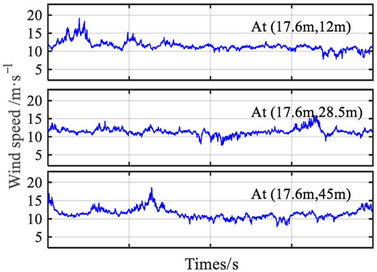 A typical time-history sample of offshore ground motion and response spectrum is shown in Figure 7 and Figure 8. It can be seen that the average response spectrum of simulated samples is close to that defined in the “Code for Seismic Design of Buildings” (GB 50011-2010), which demonstrates the applicability of simulation results. In addition, the non-Gaussian wind speed time histories at different heights are shown in Figure 9, and the comparison between the simulated PSD and the target values is shown in Figure 10. It can be seen that the two are extremely close, which proves the correctness of the simulation results.