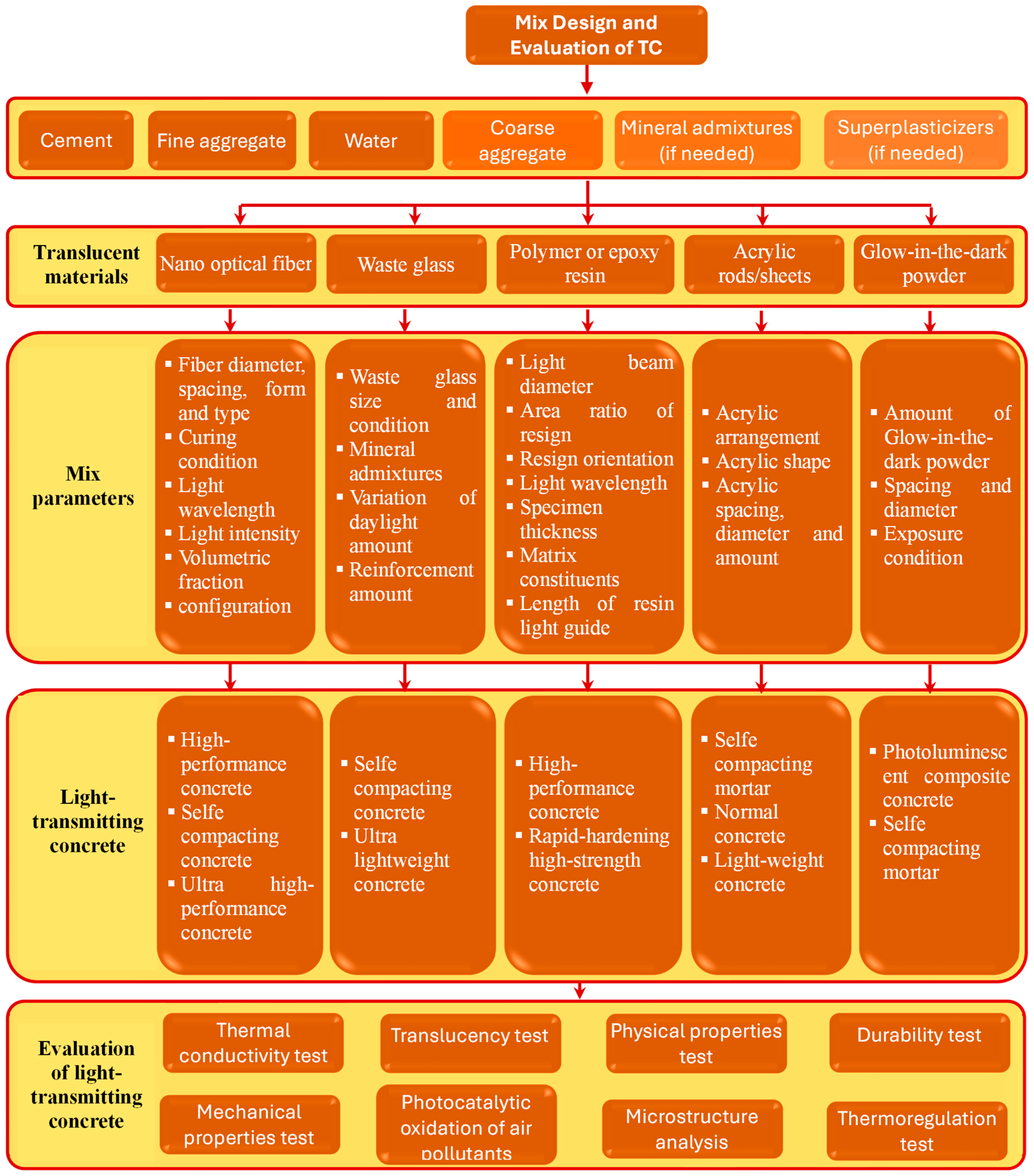 - The primary factors examined in TC studies include the spacing, amount, and size of transparent components inside the concrete matrix. Additionally, variables such as curing conditions, light intensity, angle of light incidence, and the distance between the light detector and the light source relative to the tested specimen significantly influence TC properties.