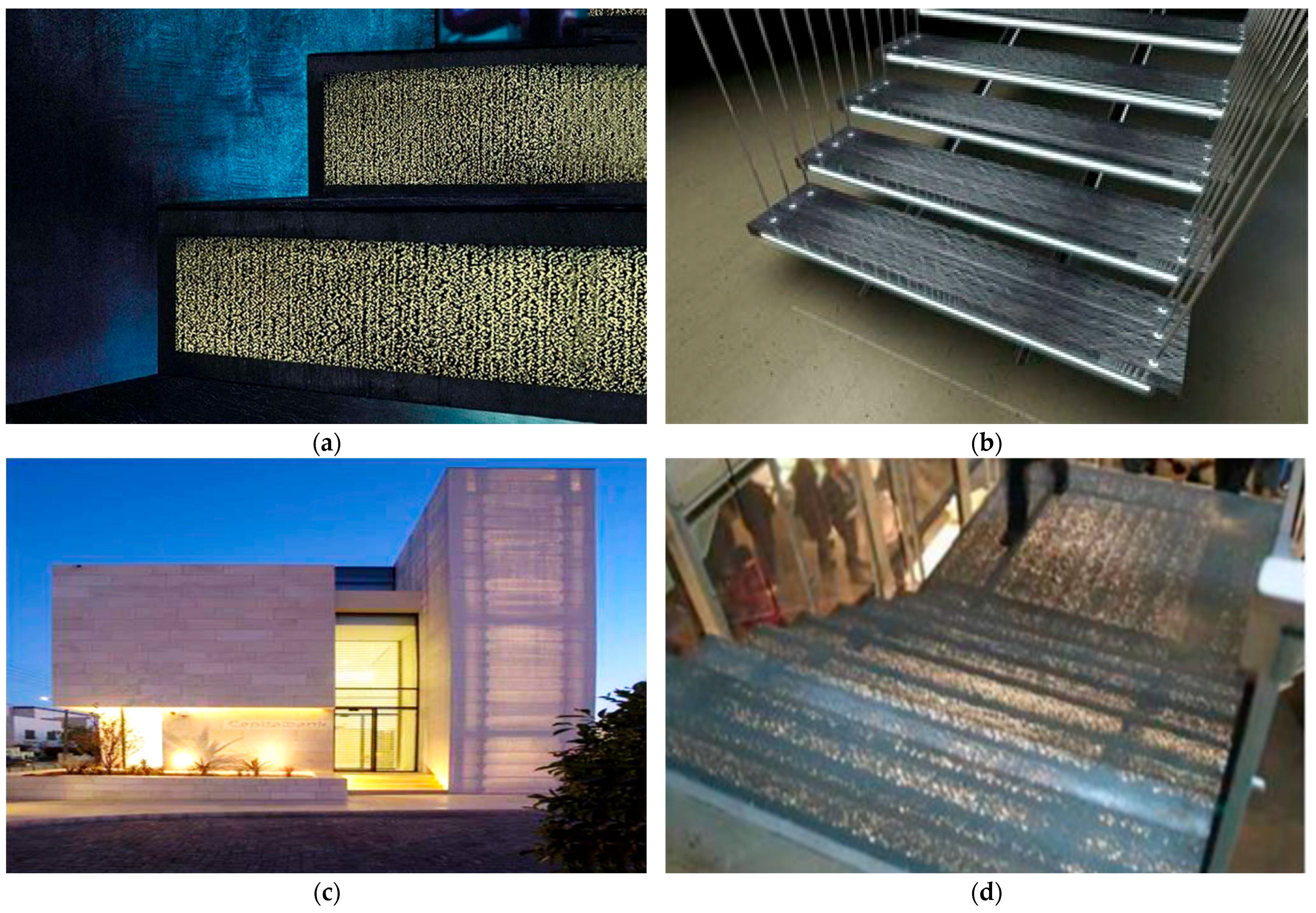 - Salih, S.A.; Joni, H.H.; Mohamed, S.A. Effect of plastic optical fibers on properties of translucent concrete boards. In Proceedings of the First International Conference on Engineering Sciences’ Applications, ICESA, Kerbala, Iraq, 24–25 December 2014. [Google Scholar]