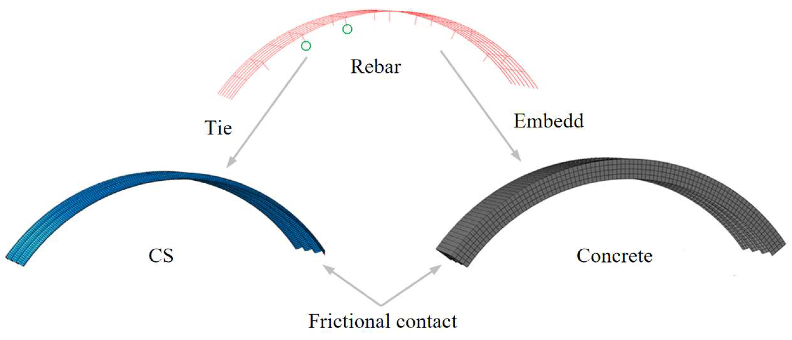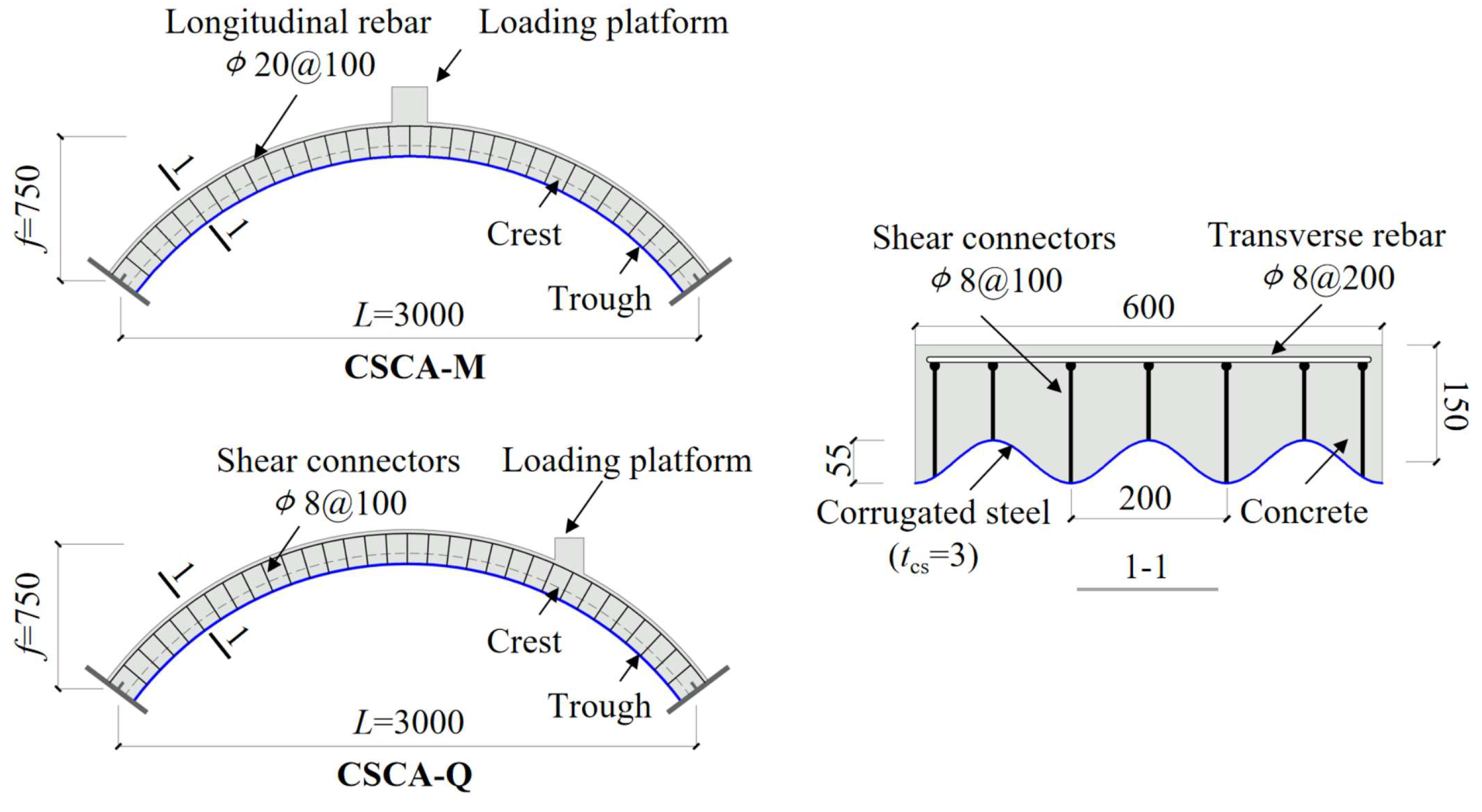 - Wu, Z.; Liu, C.; Wang, Y.; Yang, H.; Liu, F.; Yu, Z. Experimental and Numerical Studies on the Behavior of Corrugated Steel-Sprayed ECC Composite Arches with Full-Shear-Connection. Eng. Struct. 2024, 309, 118096. [Google Scholar] [CrossRef]