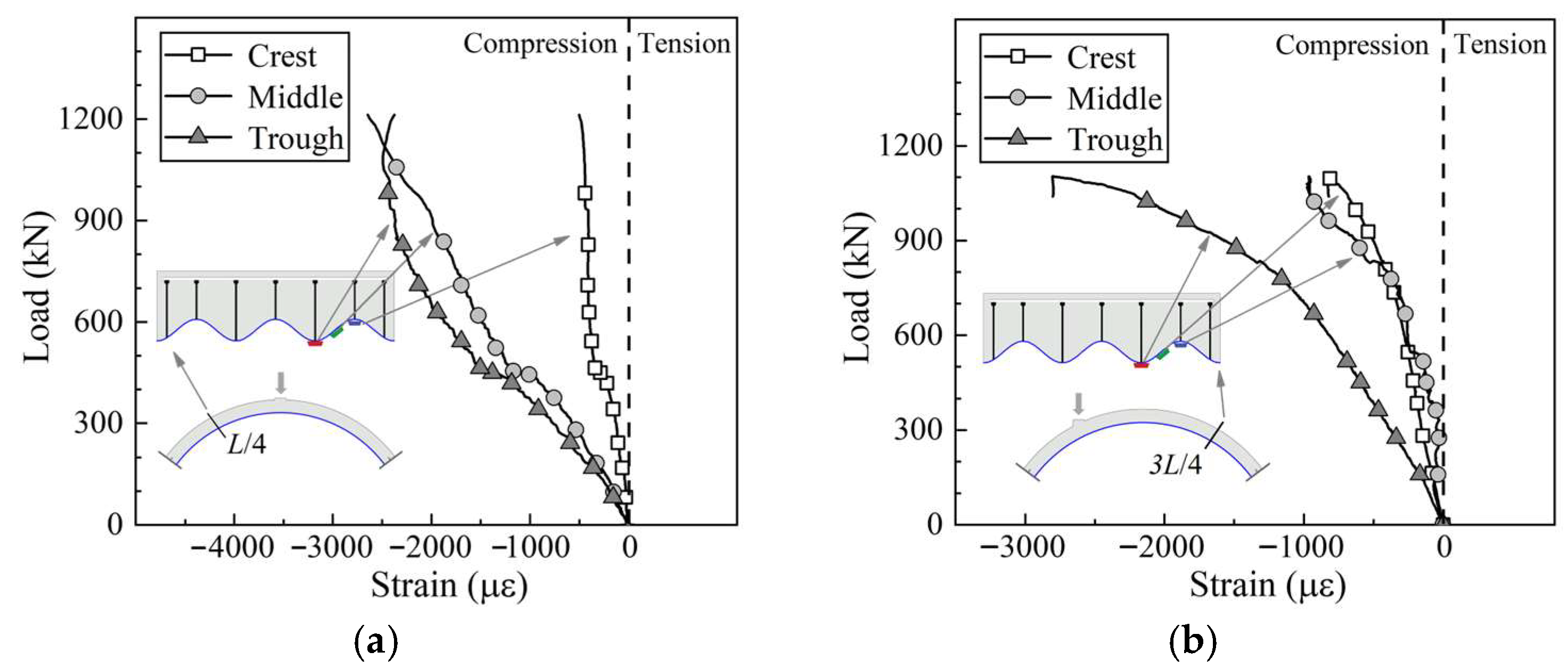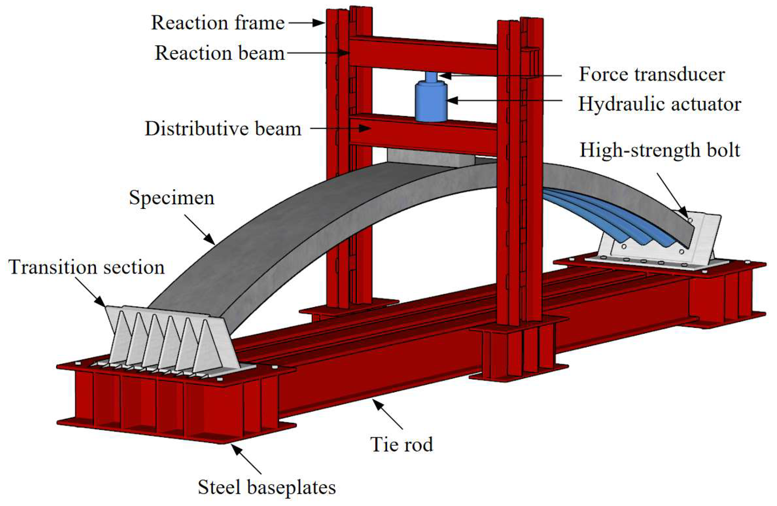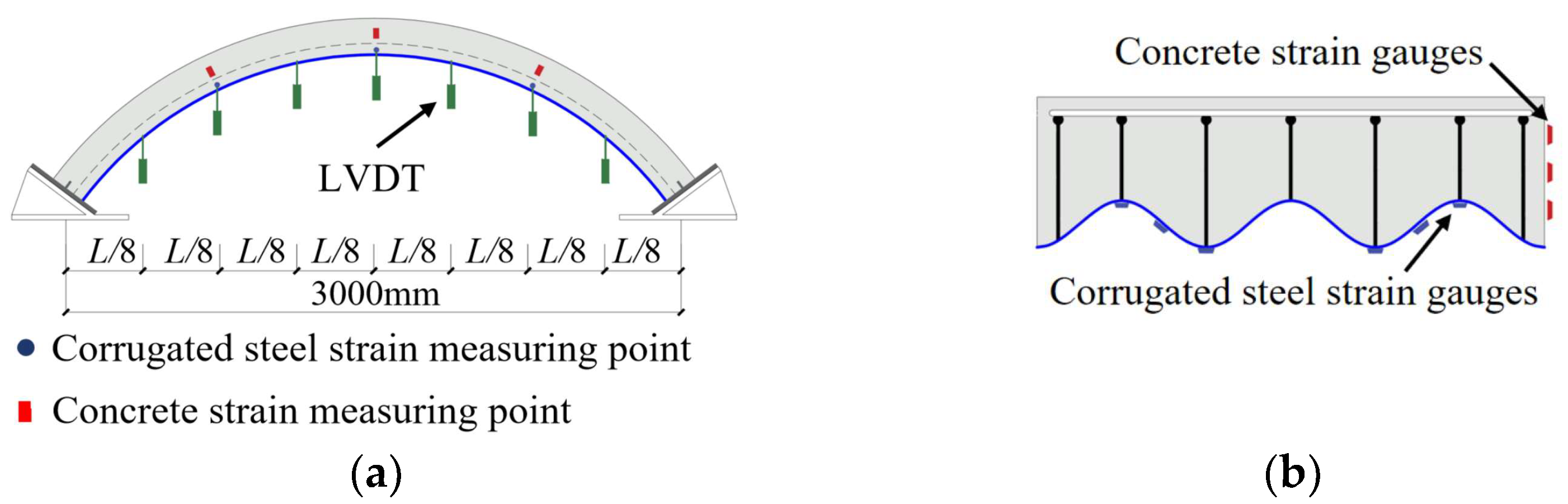 - Yang, J.; Liu, F.; Chen, B.; Liu, C.; Sun, D.; Wang, Y. Compressive-Bending Behavior of Corrugated Steel-Concrete Composite Arches: Testing, Modelling and Design. Eng. Struct. 2025, 342, 120952. [Google Scholar] [CrossRef]
