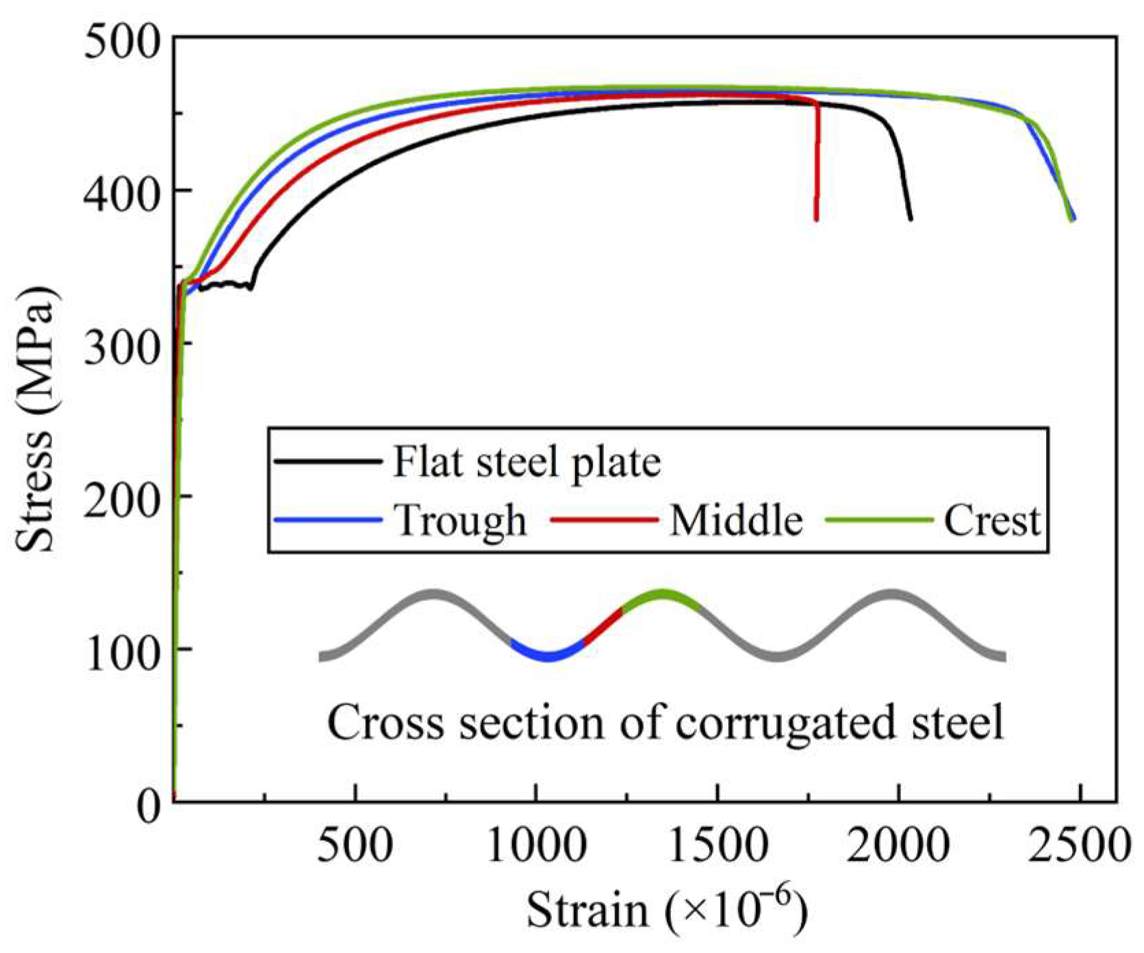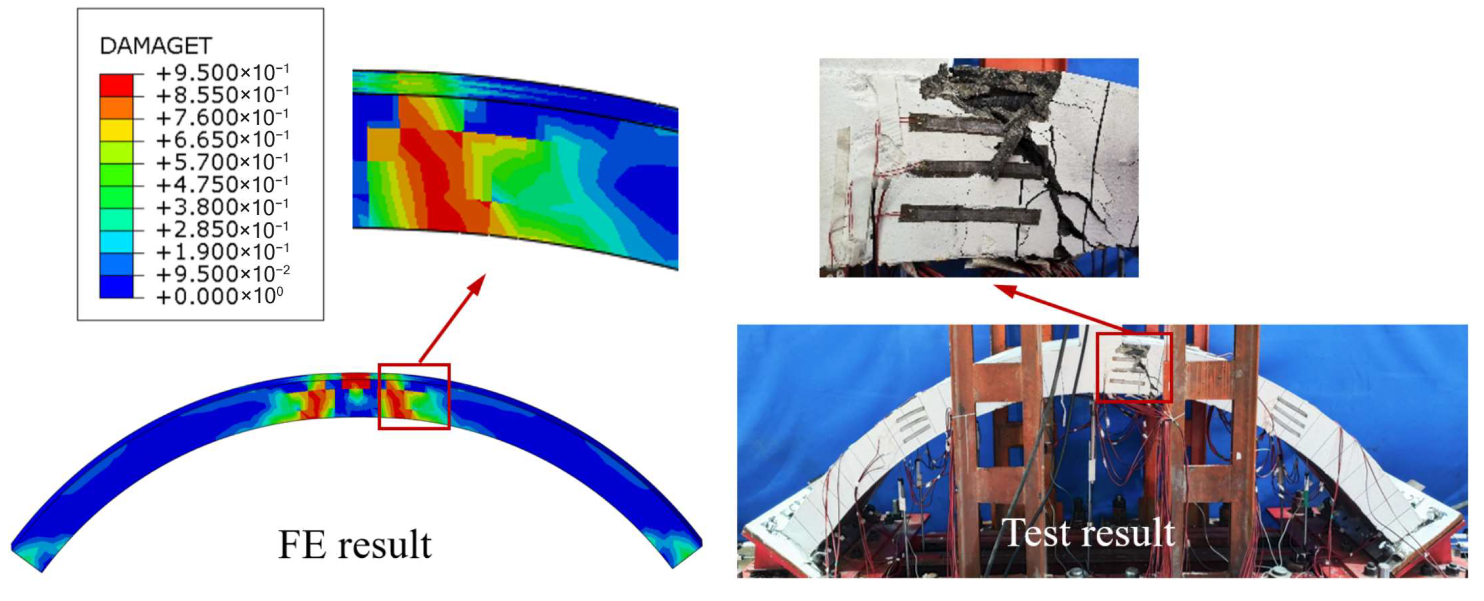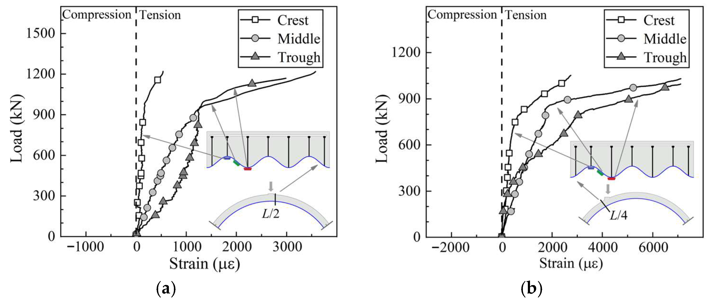 - Yang, J.; Liu, F.; Chen, B.; Liu, C.; Sun, D.; Wang, Y. Compressive-Bending Behavior of Corrugated Steel-Concrete Composite Arches: Testing, Modelling and Design. Eng. Struct. 2025, 342, 120952. [Google Scholar] [CrossRef]