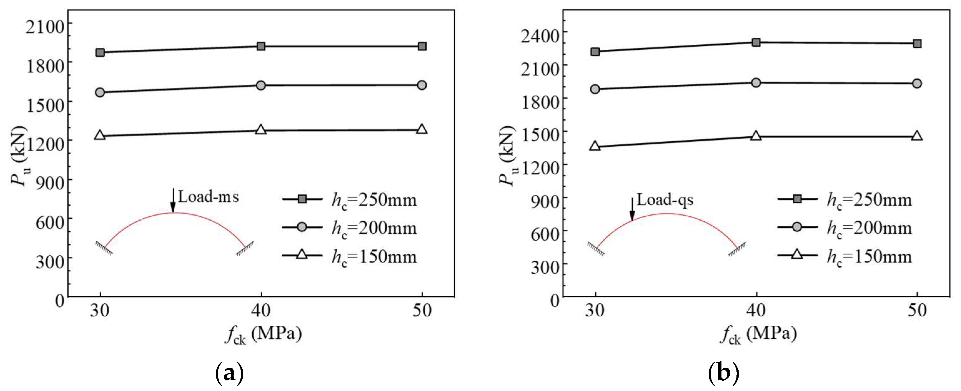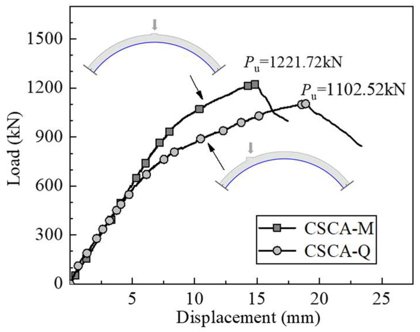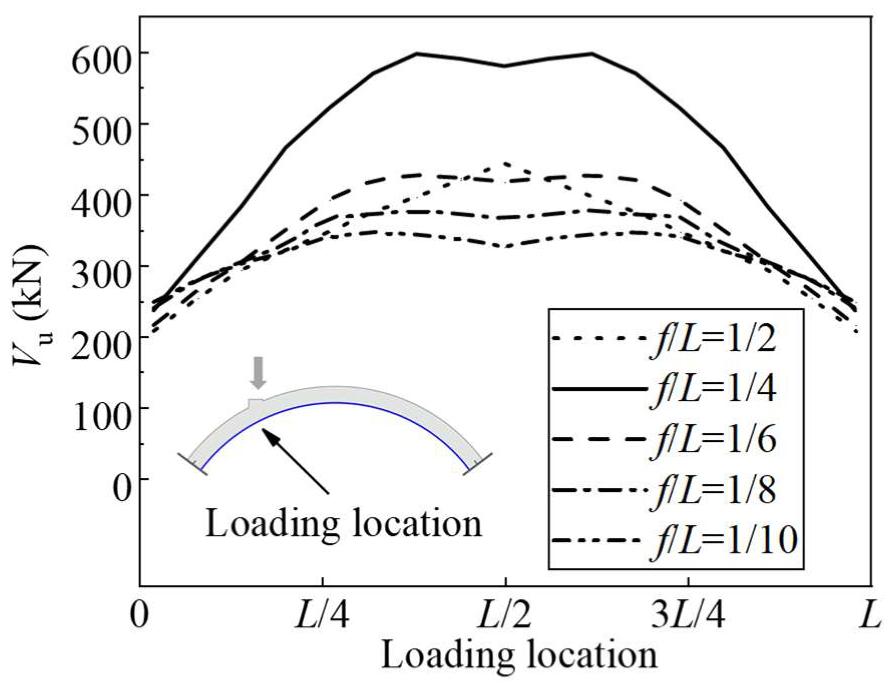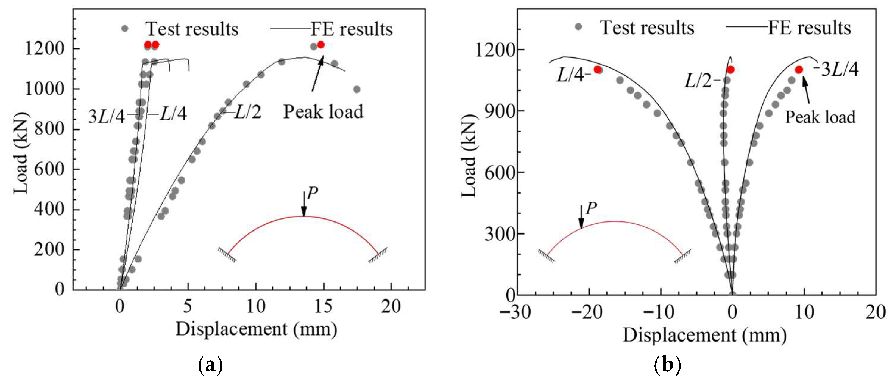 - Hu, Q.; Liu, C.; Yuan, C.; Wang, Y.; Zhang, S. Experimental Investigation into In-Plane Stability of Concrete-Filled Steel Tubular Parabolic Arches Under Five-Point Concentrated Loads. Int. J. Steel Struct. 2020, 20, 2038–2050. [Google Scholar] [CrossRef]