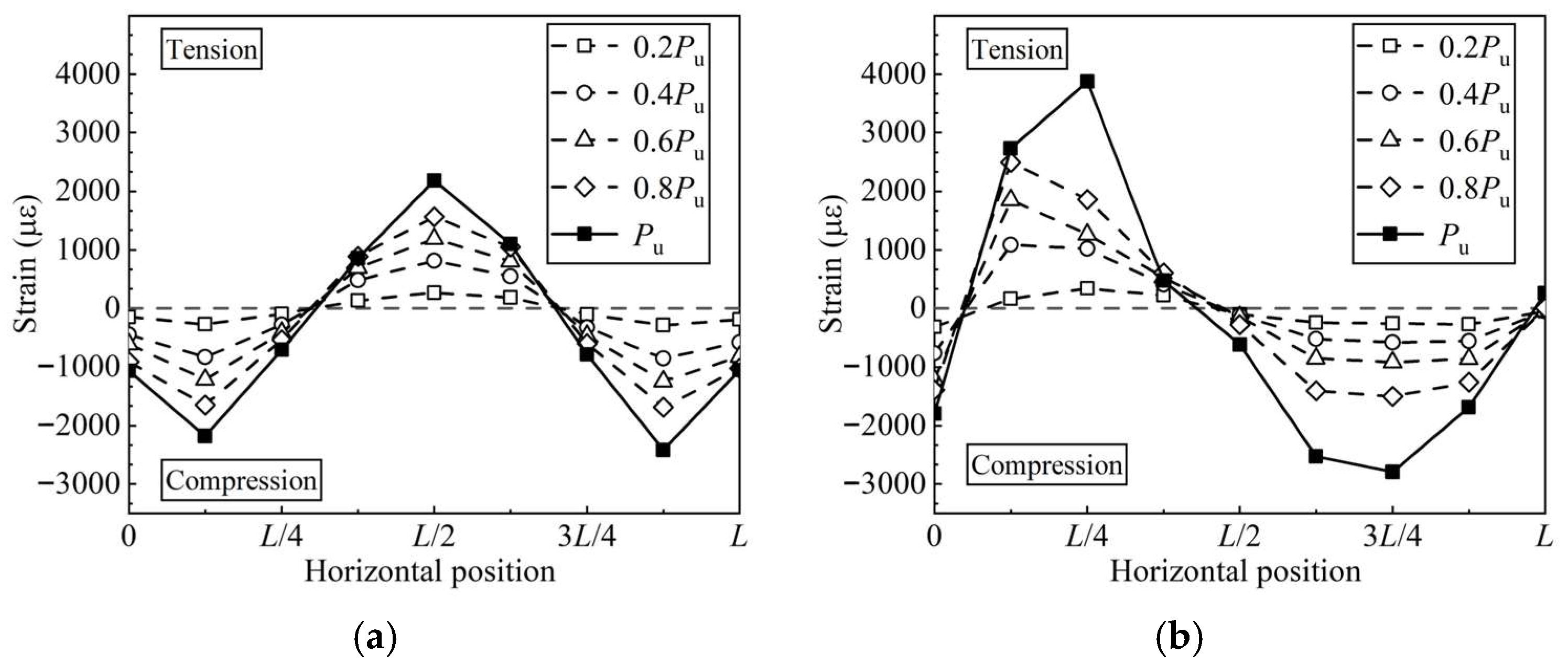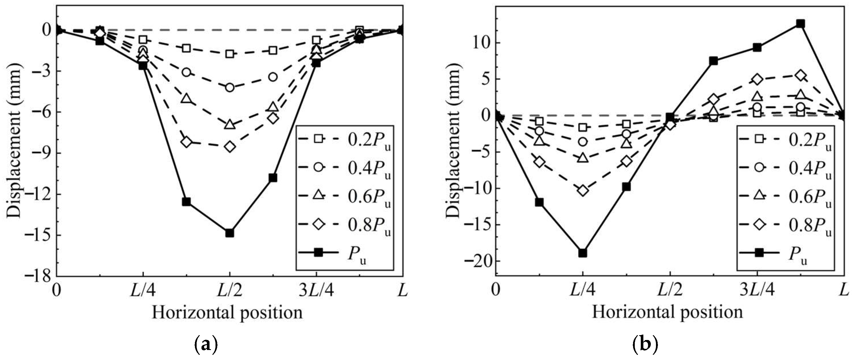 - The loading location significantly influences the structural shear capacity by altering the shear–compression ratio at the failure section. Under identical sectional shear force, the mid-span loaded specimen develops a larger axial force, which restrains the formation of shear cracks and thereby increases the shear capacity of the specimen.